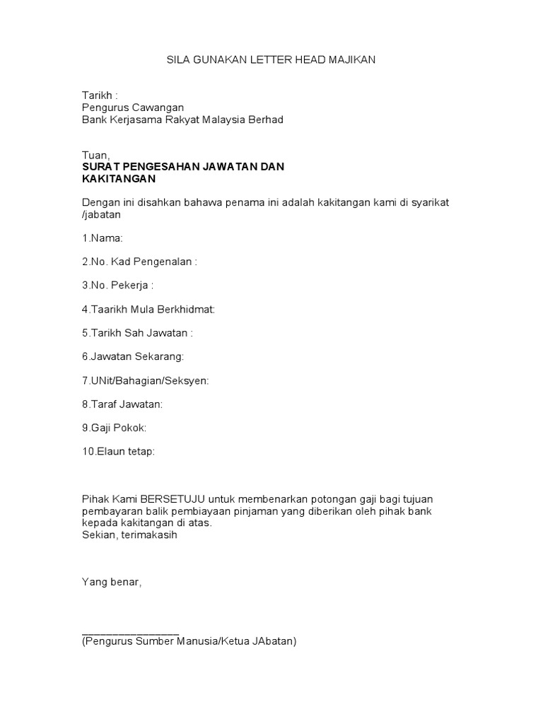 9.tanpa slip gaji, pemohon dikehendaki mengemukakan penyata ccris daripada bank negara malaysia tidak lebih 30 hari dari tarikh permohonan. Use the download button below or simple online reader. Berikut adalah contoh surat pengesahan majikan sekiranya anda ingin membuat pinjaman bank atau membeli rumah. Bagaimanakah bentuk contoh surat pengesahan majikan? Contoh surat akuan bujang daripada majikan.