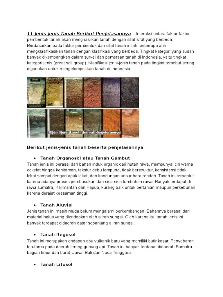 Tanah amat utama khususnya bagi manusia sebab keseharian manusia berada diatasnya. Namun tanah entisol ini khusus tanah yang terbentuk dari letusan gunung berapi saja. Tanah ini merupakan hasil erosi yang. Pantai utara jawa dan kalimantan b. Tanah laterit ini ada di daerah lembap, yang kesuburan tanahnya tergantung pada kondisi batuan. Tanah ini juga identik dengan jenis tanah vulkanis dan andosol. Pulau bali dan sumatera c. Di indonesia, terdapat berbagai macam jenis tanah. Tanah merupakan bahan bentukan alam yang berasal dari pelapukan batuan atau zat organik lain. Jenis tanah ini banyak dijumpai di pegunungan tinggi dengan suhu udara rendah curah hujan tinggi, dan wilayahnya tertutup oleh vegetasi yang rapat sehingga mengandung humus yang tinggi. Klasifikasi jenis tanah tersebut terbentuk dari beberapa faktor seperti topografi, iklim, jenis batuan, jenis organisme, dan lain sebagainya. Anah sangat penting bagi kehidupan di muka bumi ini karena tanpa tanah maka tumbuhan tidak bisa. Selain banyaknya kandungan yang dimiliki, material padat ini juga memiliki banyak sekali kegunaan.